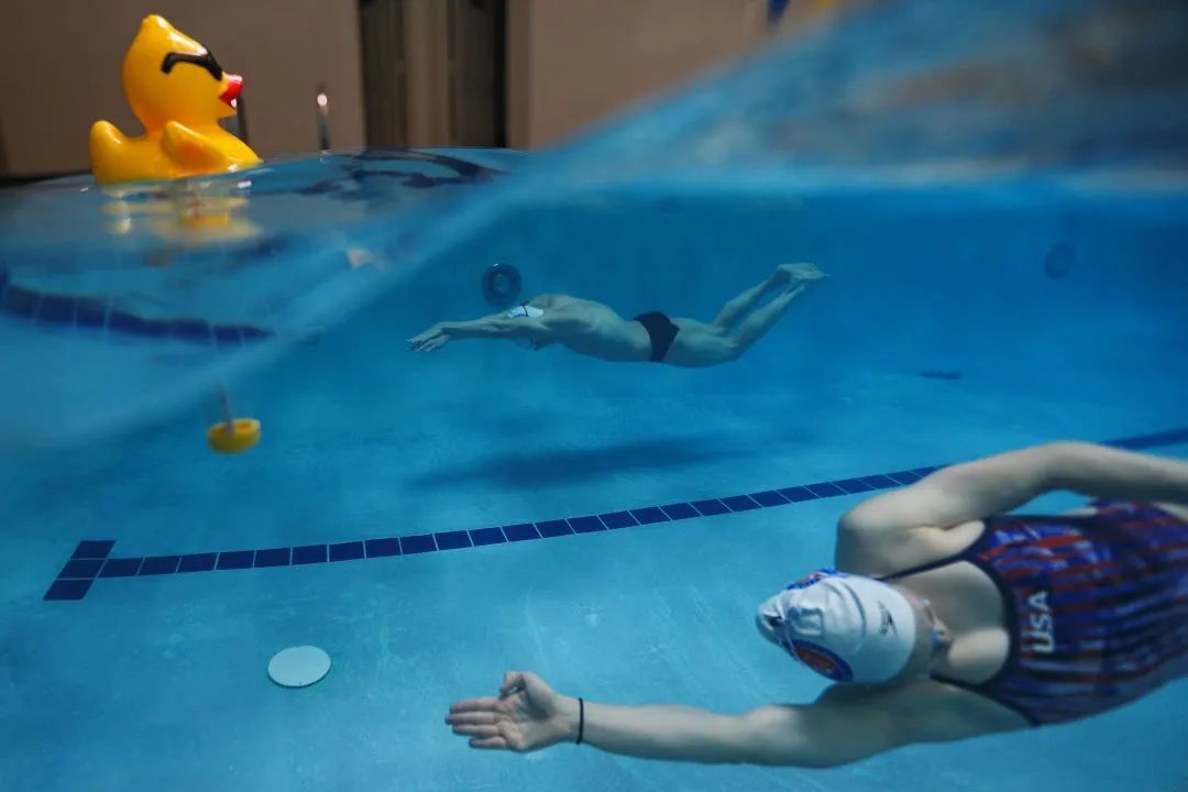 ▲2020年4月28日,受新冠疫情影响,美国游泳国家队选手在私人小型游泳池进行训练 图/视觉中国