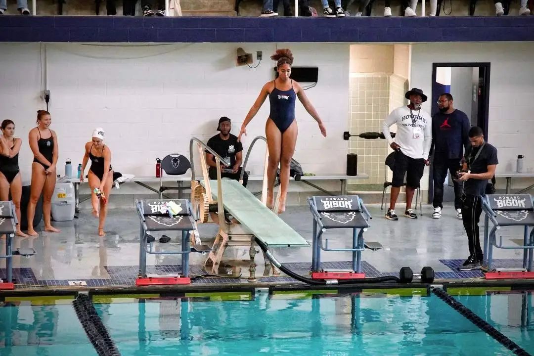 ▲2022年10月12日,美国华盛顿特区,费比-霍普水上运动中心,美国霍华德大学游泳队与乔治敦大学游泳队的学生进行跳水比赛 图/视觉中国