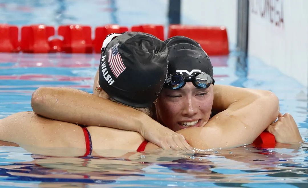 ▲2024年7月28日,巴黎奥运会女子100米蝶泳决赛,美国选手托丽·胡斯克(右)和队友庆祝夺冠 图/IC photo